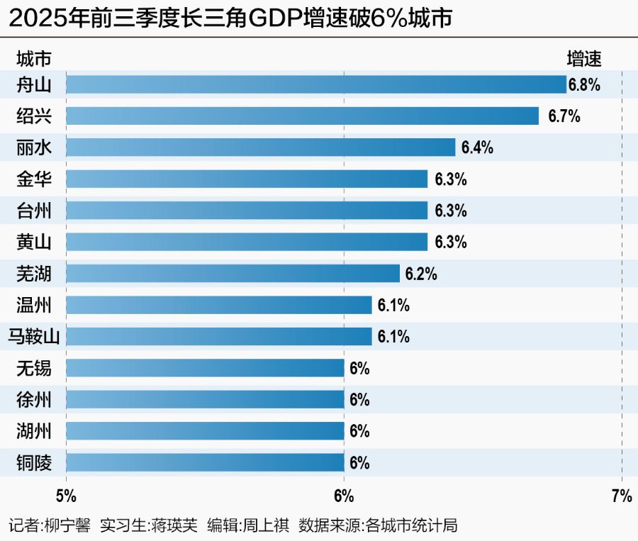 在长三角41座城市中嘉盛投资,前三季度共有13座城市经济增速突破6%,由高到低分别为舟山、绍兴、丽水、金华、台州、黄山、芜湖、温州、马鞍山、无锡、徐州、湖州、铜陵。