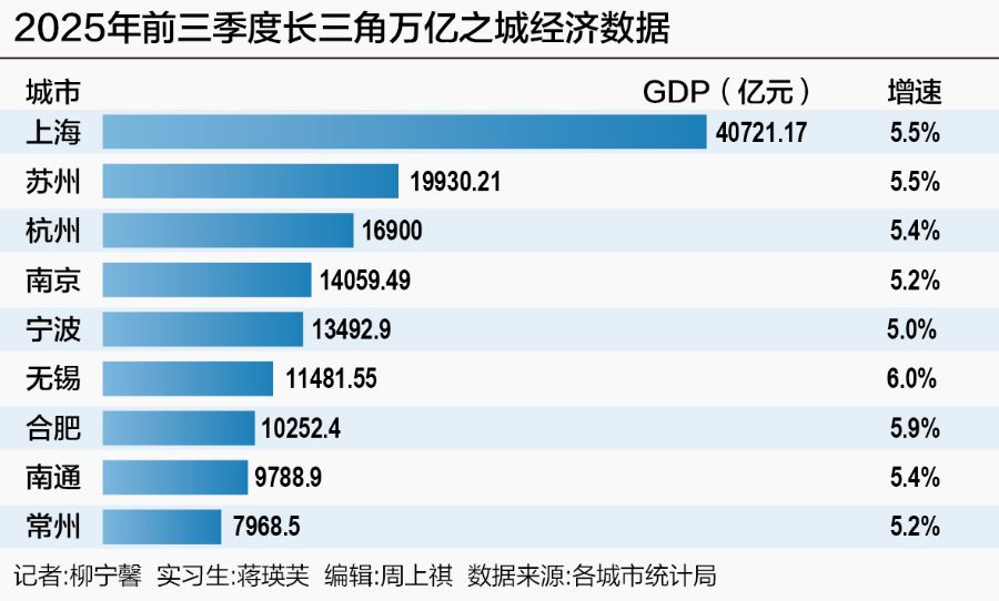 长三角共有9座万亿GDP城市。从经济规模看,上海、苏州、杭州、南京、宁波、无锡、合肥等7座城市前三季度GDP突破1万亿元,南通以9788.9亿元紧随其后,常州这座新晋万亿之城在前三季度实现7968.5亿元的GDP规模。